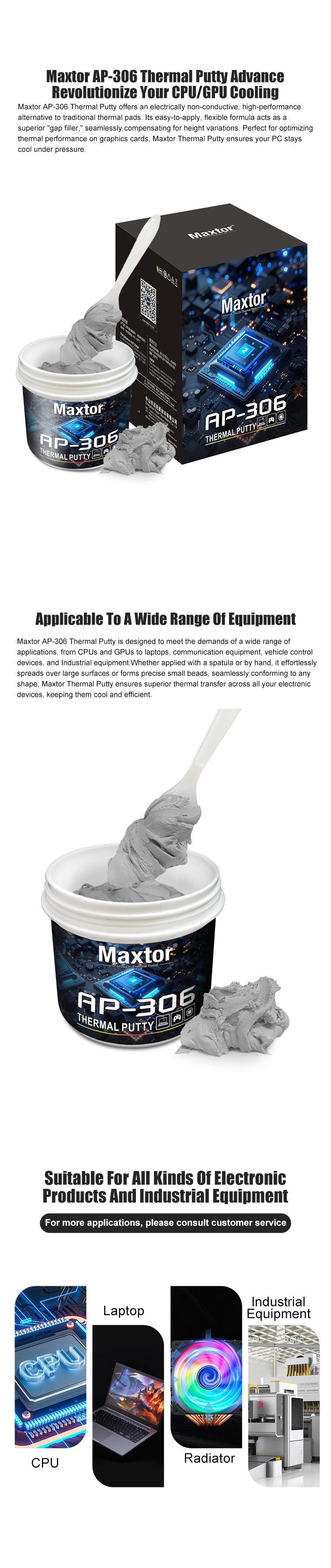 Thermal putty is a soft, formable thermal interface material designed to fill irregular gaps between heat-generating components and heat sinks or metal housings. It provides excellent thermal conductivity and ensures stable heat dissipation even in uneven or complex surfaces.