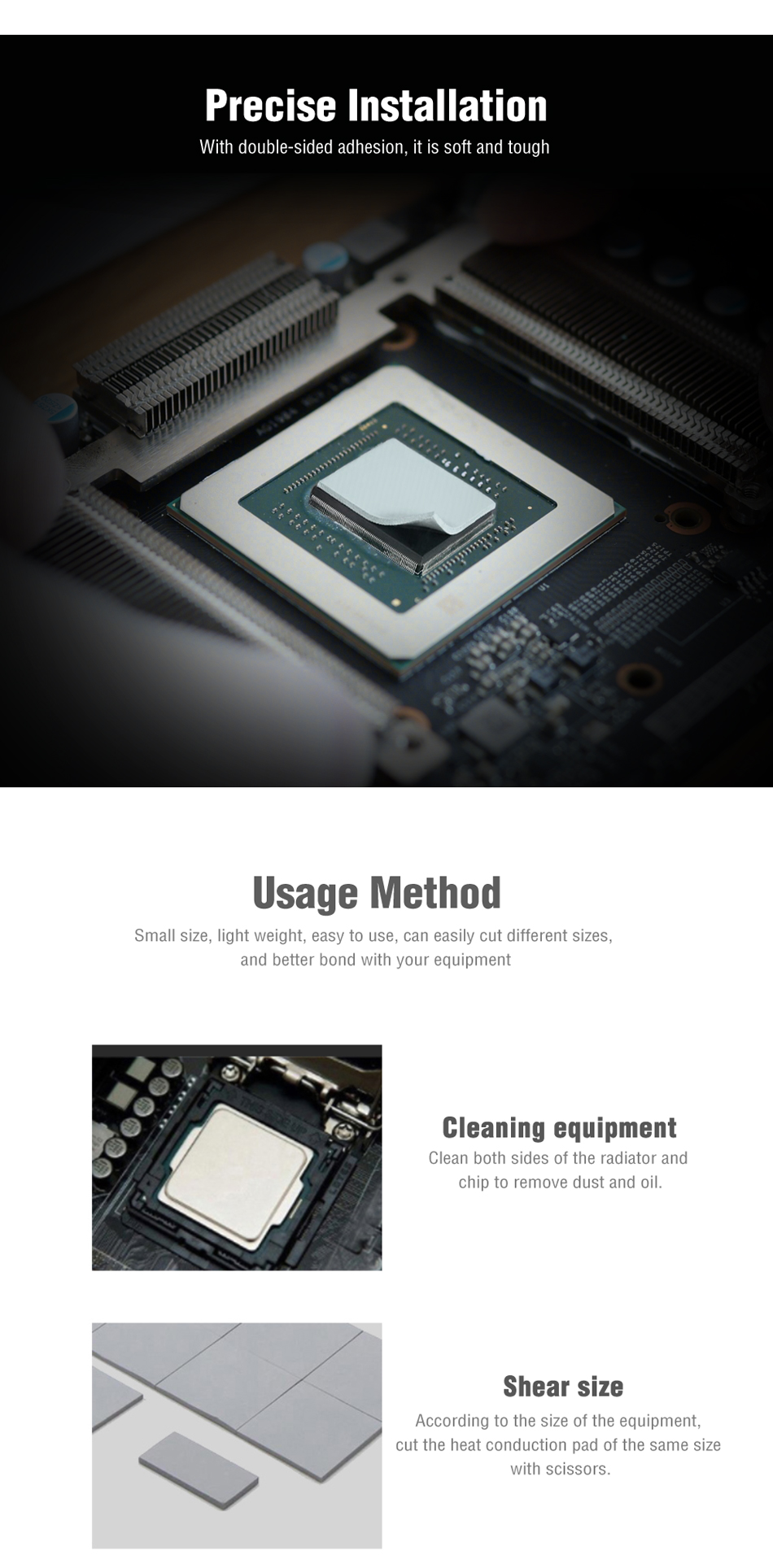 First, clean both surfaces thoroughly. Then remove the protective films on both sides of the pad. Place the pad evenly between the component and the heat sink. Apply uniform pressure to ensure complete contact and eliminate air gaps. Proper installation ensures maximum thermal efficiency and reliable heat dissipation.